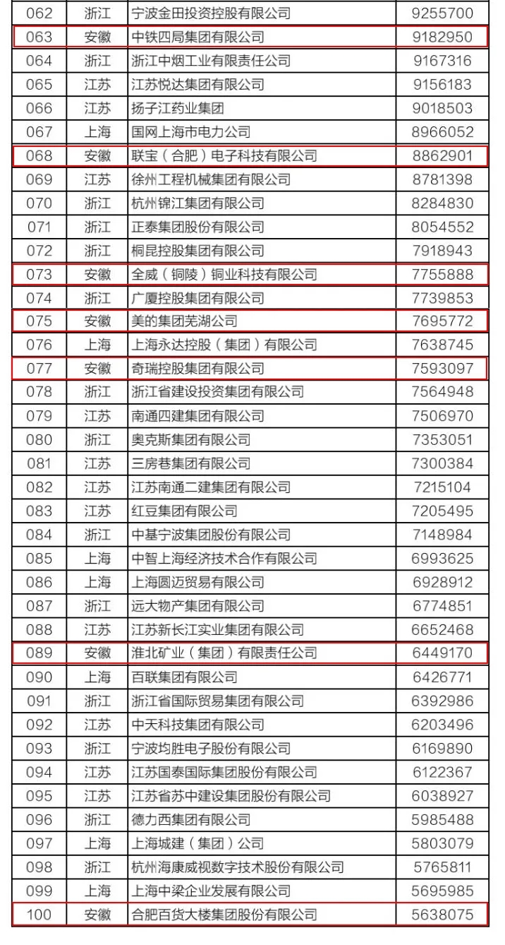 該榜單以2019年企業營業收入為入圍標準,由長三角三省一市企業聯合會共同發布。今年是第二次發布長三角企業百強排行榜,入圍門檻是563.8億元,比上年提高了54.5億元。今年我省共有9家企業上榜,除淮北礦業集團外,其他8家企業為海螺集團、銅陵有色、中鐵四局、聯寶(合肥)電子、全威(銅陵)銅業、美的集團蕪湖公司、奇瑞控股集團和合肥百大,主要分布在水泥建材、有色金屬、汽車制造、煤炭和煤化工等行業。