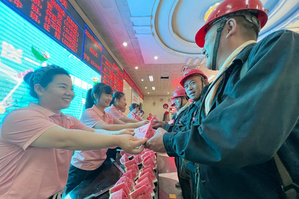 “王師傅,你這剛升井,吃塊西瓜降降溫。”