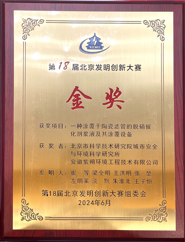 日前,在第18屆北京發明創新大賽頒獎典禮上,紫朔環境公司憑借卓越的研發實力,“一種涂覆于陶瓷濾管的脫硝催化劑漿液及其涂覆設備”的創新項目獲得大賽金獎。